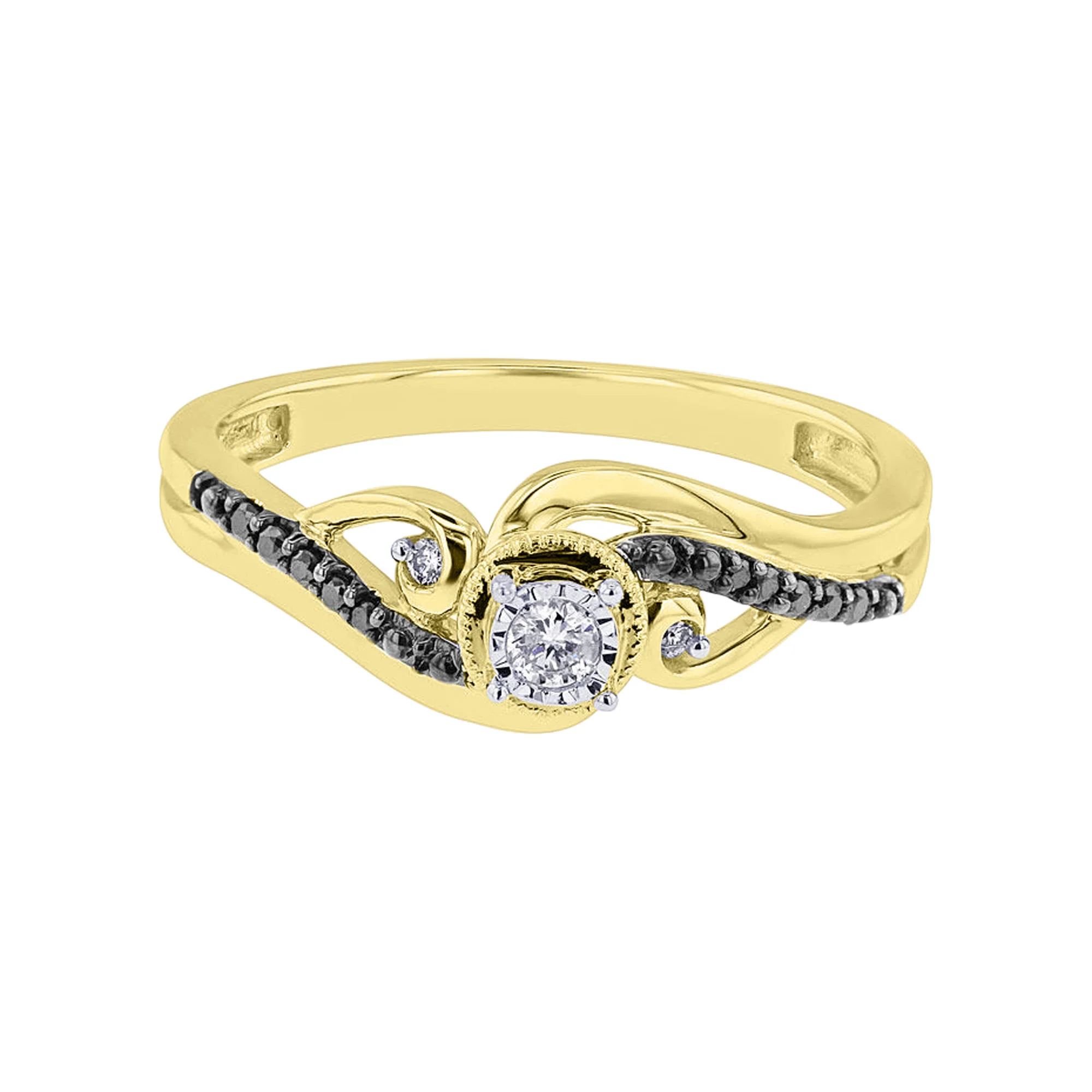 Put an edge on her dream ring, without sacrificing any sparkle. An intricately swirled band of 14 karat gold holds well matched black round brilliant diamonds. A round brilliant center diamond, expertly placed in a mirage setting, provides the ultimate contrast - creating a dramatic effect that will be the highlight of her every day.