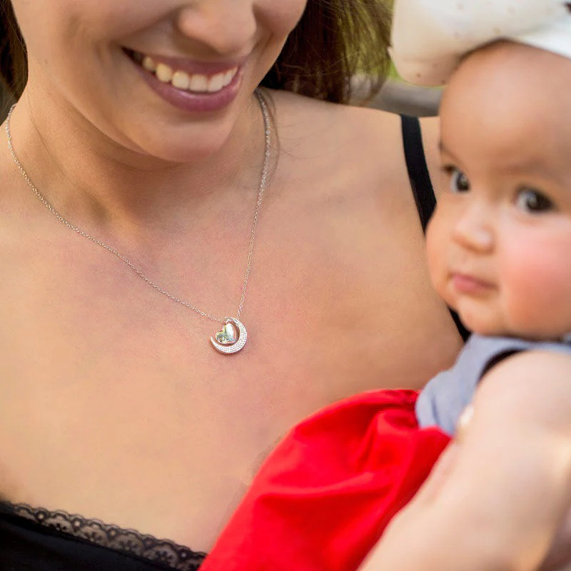 Do you want to give her the gift she won't ever forget? Look no further than this I love you to the moon and back heart necklace. High polished sterling silver has a heart elegantly dangling displayed beside the moon. A touch of 1/20 carat diamonds compliments the necklace creating a dazzling look she will adore. And a little secret, I love you to the moon and back is engraved on the other side. Close to her heart.