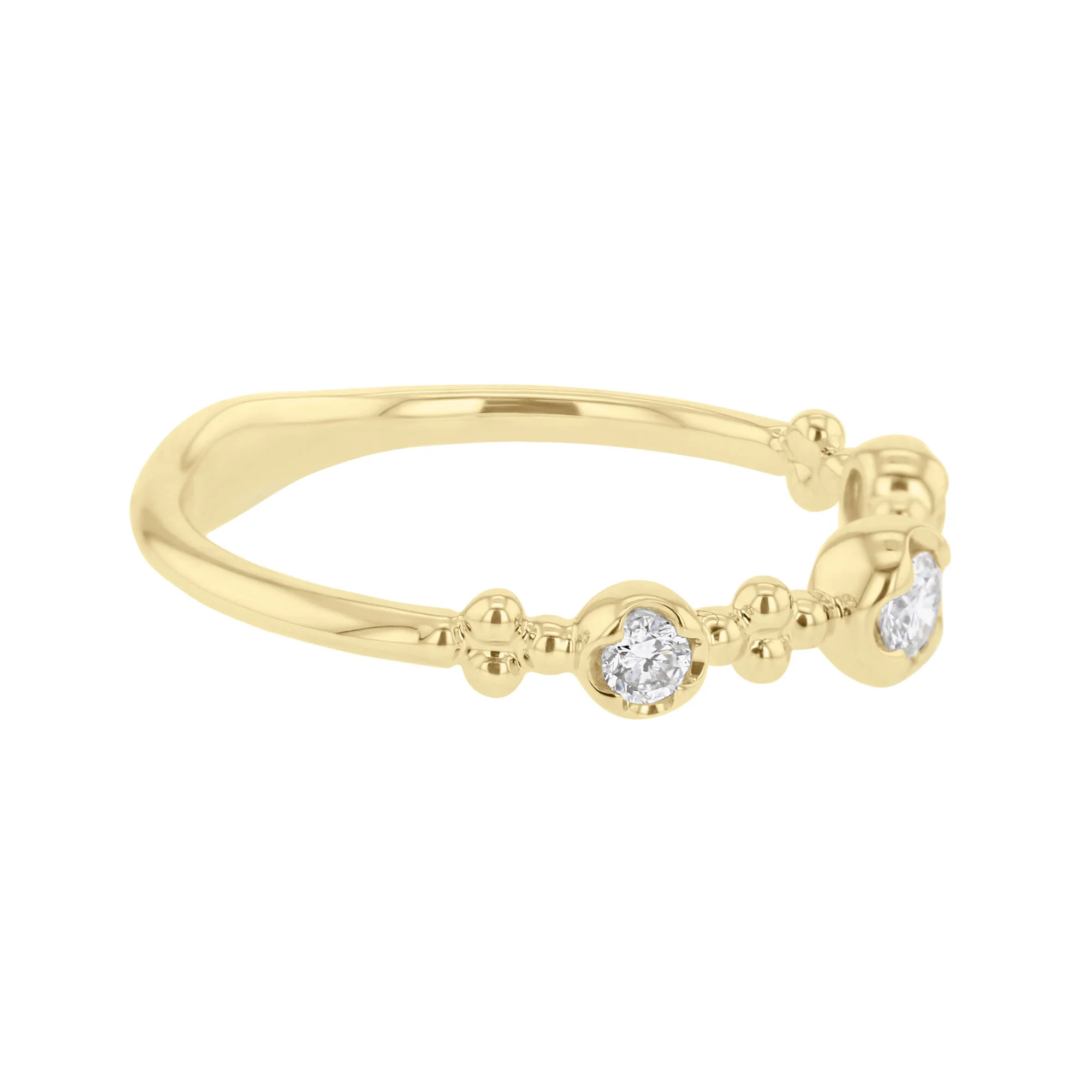Three dazzling round diamonds totaling 1/5 carat are set in a high polish modern 14 karat gold ring. This ring is a fun, everyday look on it's own, but would add a unique layer to a stacked look too!
